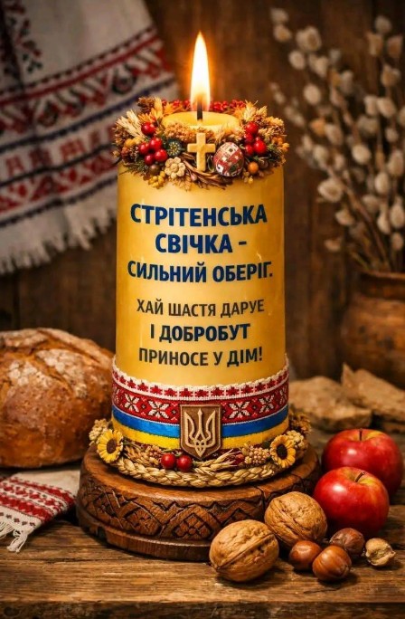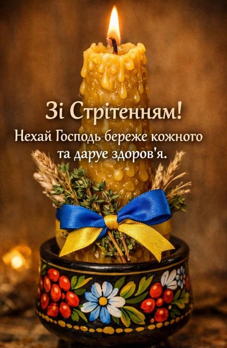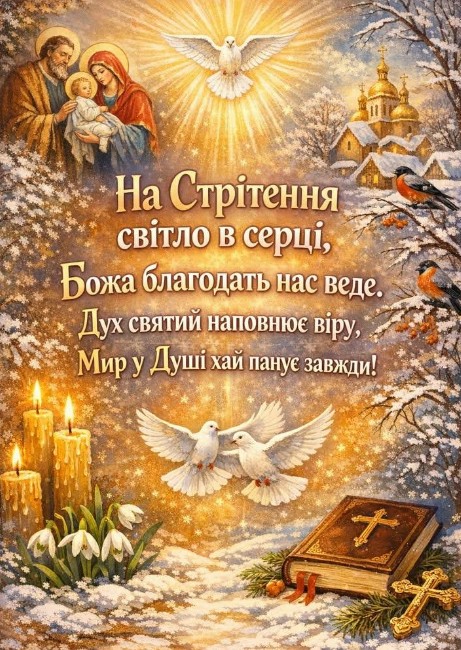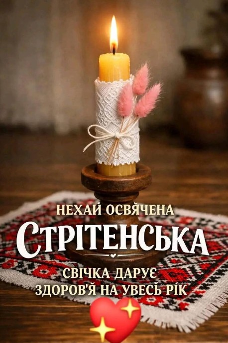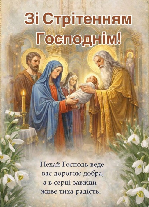 Одним із дванадцяти найбільш значущих у християнстві свят є Стрітення Господнє. Переводиться, як "встреча" маленького Ісуса в церкві з праведником Симеоном, в лице якого відбулася зустріч всього народу з Богом. Відмічається Сретение Господнє 2 лютого. В цей день вірять, що щире прошення в молитвах Бог обов'язково виповнить, допоможе і благословить воду, яка буде мати чудодійну силу для тіла і душі. У вас є можливість привітати зі Сретенням Господнім листівкою, побажати благополуччя та удачу, щастя і Боже благословіння в справах. В цей день не можна робити різну важку роботу, не можна ссоритися і ругатися, небажано путешествовать. В цей час починаються останні перед весною морози, відбувається зустріч зими з весною.